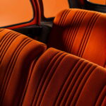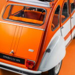 What stands out most about the 2CV Spot is the consistency of its identity. Every detail is designed to create a harmonious whole: the two-tone body in Orange Ténéré and Blanc Meije, the orange-and-white striped sunshade mounted above the front seats, the door panels featuring the same two-tone pattern, the stainless steel wheel covers borrowed from the Dyane, and the Orange Vénitien jersey fabric upholstery with separate front seats. On each front door, a “Spot” sticker completes the look in white on an orange band. The car is essentially a 2CV 4, whose 435 cc engine allows it to exceed 100 km/h, with fuel consumption of 5.4 liters—a frugal figure suited to the daily driving habits of the time. It was sold for 13,600 francs.