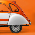 The story of the 2 CV Spot began in 1974, in designer Serge Gevin’s studio. He submitted two designs to Citroën, each with a distinctly different color scheme. The first played on dark, sporty contrasts. The second, the one that was ultimately chosen, offered a completely different vibe: an orange 2CV with white fenders, whose soft top and door panels featured orange and white stripes reminiscent of a beach chair canopy, conveying a cheerful, summery image.